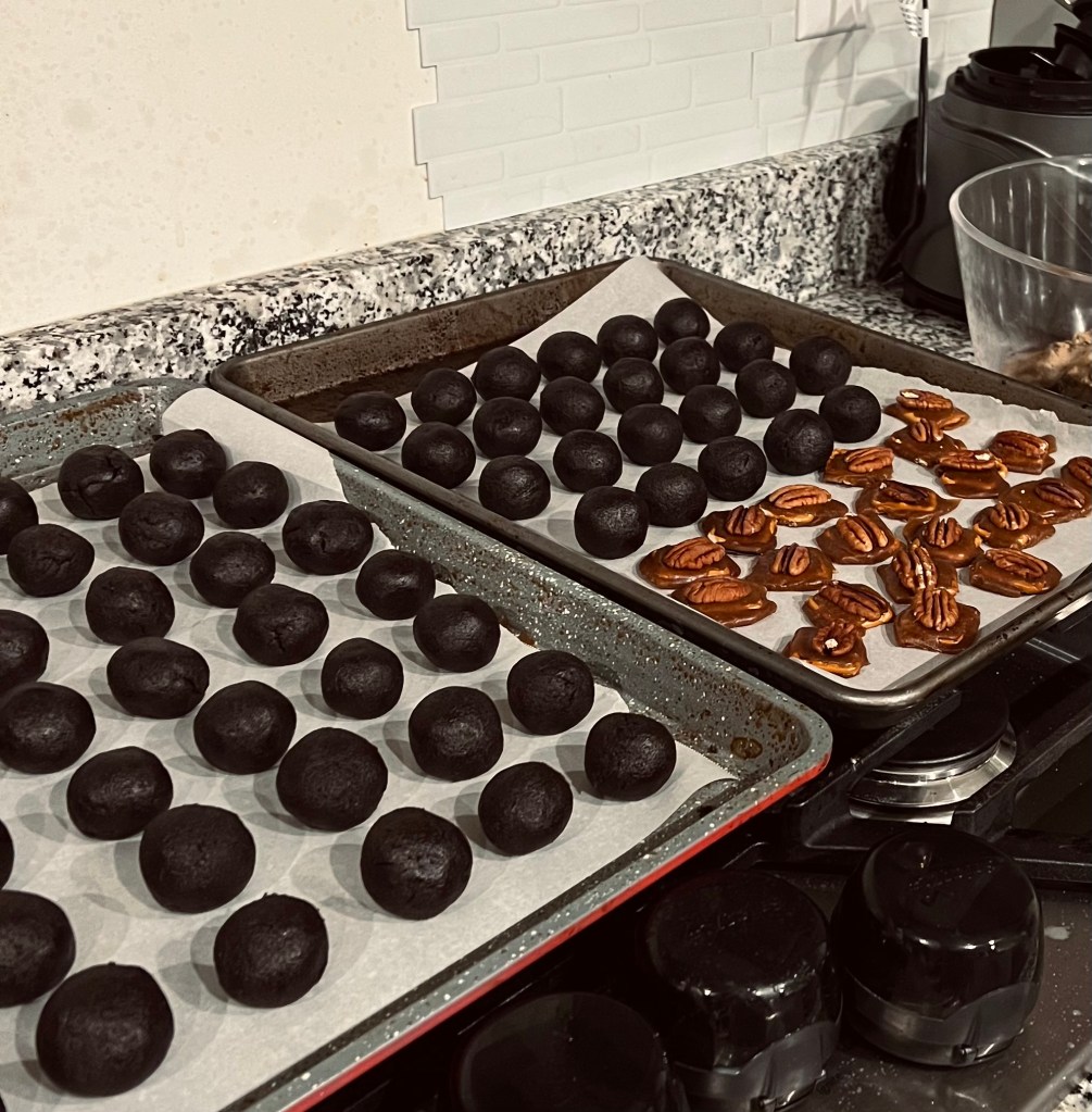 Roll your dough into balls about 1″ wide and place on a cookie sheet. They don’t need to be super far apart, since we won’t be baking them. *note* At this point the dough is entirely safe to eat… just saying. Place your sheet of balls of dough in the freezer for 15 minutes to chill. If you skip this step, it will be very messy and difficult to add the last ingredient.