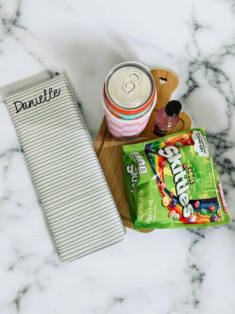 I started by picking up some adorable, mini charcuterie boards from Michael’s craft store and some cans of Alani Nu from my local grocery store. I threw these in some girly, tall can coozies from Parker and Rae and added them to each guest’s bag.