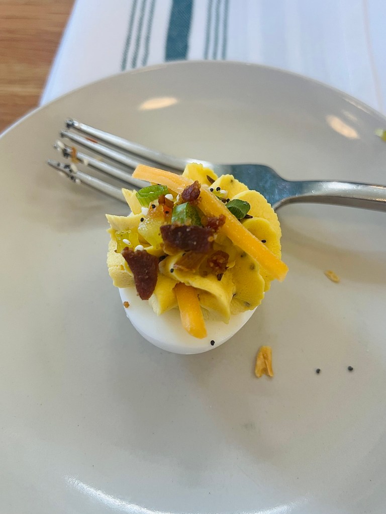 Our table decided on an appetizer and ordered the DIY deviled eggs platter, a clever setup of deviled eggs, accompanied by a selection of toppings to add. The eggs were a bit plain, even with the garnishes, but I did love the concept of being able to pick and choose which toppings you want, a perfect solution for large groups with multiple different tastes. The platter came with six eggs, a generous portion for a couple of friends, along with green onions, bacon, cheese, pickled red onion, everything bagel seasoning, and some green tomato sauce.